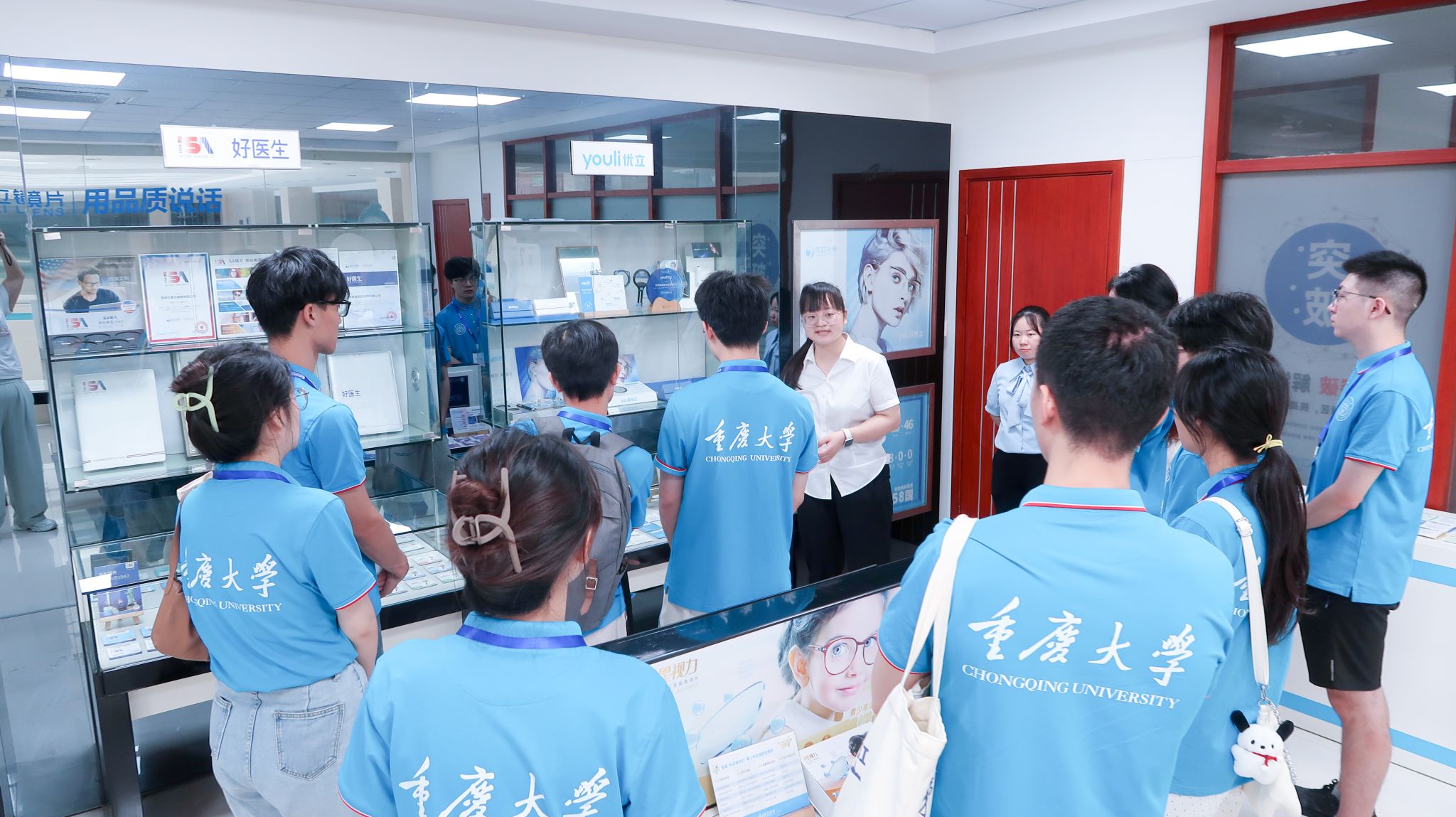 在优立光学的企业展厅中,各类创新成果和专利技术琳琅满目,企业专业人员带领团队师生了解优立镜片的创新技术、体验不同镜片的功能、发掘科技赋能的优势,让同学们深刻领会了创新驱动发展、品质保障立足的行业规则。