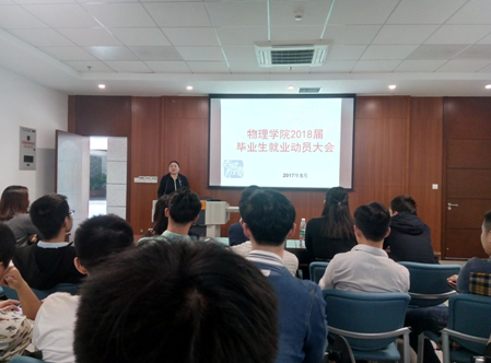 2018届本科生就业动员大会在理科楼LA101顺利召开,学院党委副书记萧倩老师、2014级辅导员林玮老师、13级优秀毕业生代表及2014级全体同学到场参加本次动员大会。