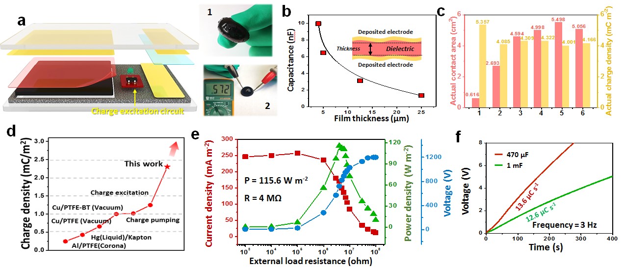 图.a)电荷激励TENG的结构示意图(插图1碳凝胶电极的实物图,插图2碳凝胶电极的电学性质), b)由不同厚度的电介质制成的电容器的电容,c)六种不同优化结构的TENG的有效接触面积和真实电荷密度,d) TENG的输出电荷密度比较,e)不同外部负载下的输出电流,电压和峰值功率,f)使用电荷激励TENG为电容器充电的充电曲线。