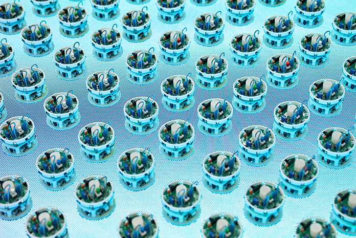 活性物质集群在自然界的各种尺度下广泛存在,包括菌落、细胞组织、蚁群、鱼群、羊群和鸟群等。课题组基于超大型LED屏作为可编程数字化虚拟环境平台,结合原创设计的环境耦合型机器人集群,为活性物质家族增加的一个新成员:机器人活性物质(Robotic Active Matter)。该系统攻克了传统的活性物质研究中难以解决但又十分重要的集群个体与环境相互耦合的难题,满足了活性物质个体感知环境的同时也可以改造环境的需要,且个体与环境的动态耦合特征可定义、可量化和可编程。