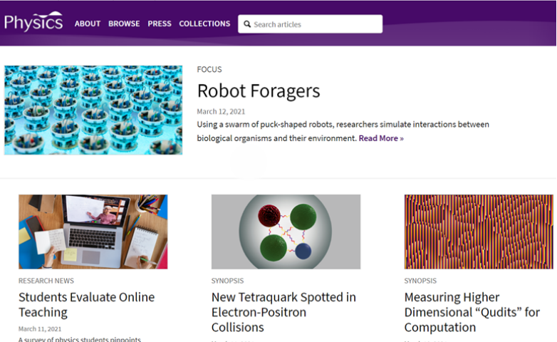 APS(美国物理学会)《物理》杂志在其官方网站澳彩网置顶报道了该工作//physics.aps.org/articles/v14/38 并称赞这一新的研究可以帮助揭示生态系统中隐藏的复杂性和未探索的现象,为实验室中演示集群涌现行为提供了一条新的途径。该研究工具可以解决在实际场景中或计算机模拟中难以探索的问题,也可能会在许多受生物启发或其他因素影响的活性物质问题中被证明是非常有用的。