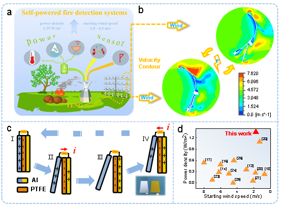 图示: TENG 的应用及工作原理。(a) TENG 在自供电智能监测系统中的应用。 (b)单个可旋转部件在4.3 m/s风速下的模拟速度云图。(c)TENG工作原理和实物照片。(d)功率密度和启动风速与其他基于流致振动工作的对比。