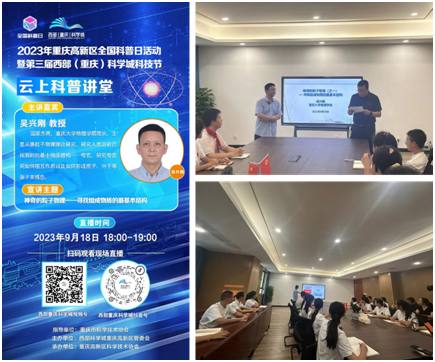 2023年9月18日,学院吴兴刚教授受邀走进四川外国语大学重庆科学城中学,给同学们带了《神奇的粒子物理--认识组成物质的最基本结构》的科普报告。吴兴刚教授从老一辈物理学家的爱国精神出发,鼓励同学们努力学习,报效祖国。报告中,吴兴刚教授通过“我们从哪里来,到哪里去,又如何构成?”等问题出发,引导同学们去认识组成微观世界的基本物质结构。吴兴刚教授在报告中讲到,好奇心是支撑粒子物理发展的强劲动力,大胆想象、小心求证,让未知成已知,精彩而又神奇的微观物质世界等你去揭秘。