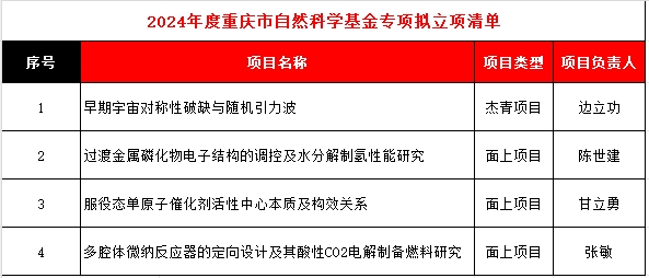 近日,重庆市科技局发布了《2024年度重庆市自然科学基金专项拟立项清单公示》,我院立项重庆市杰出青年科学基金项目1项、重庆市自然科学基金面上项目