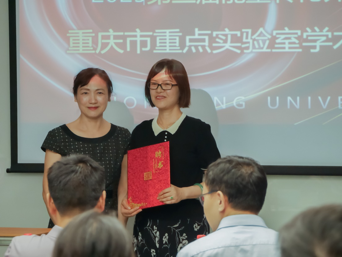 对重点实验室的大力支持,并表达了对在座专家长期以来无私帮助的感谢。随后,重点实验室主任王蜀霞教授介绍了“能量转化界面物理重庆市重点实验室”的近期发展情况并为胡陈果教授颁发了“能量转化界面物理重庆市重点实验室终身荣誉成员”聘书。