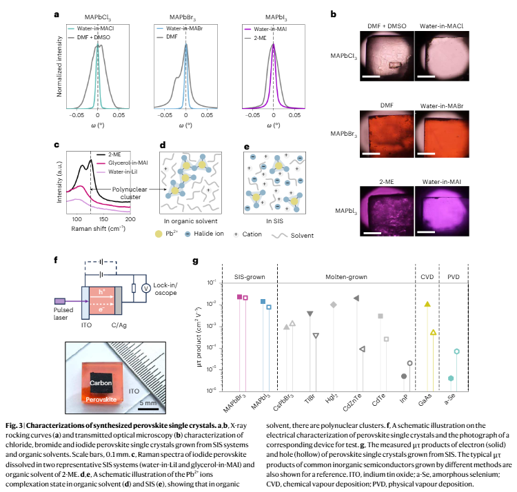 图:基于该新技术制备的铅卤钙钛矿单晶的结构和电学表征,及其与商业化半导体的比较。