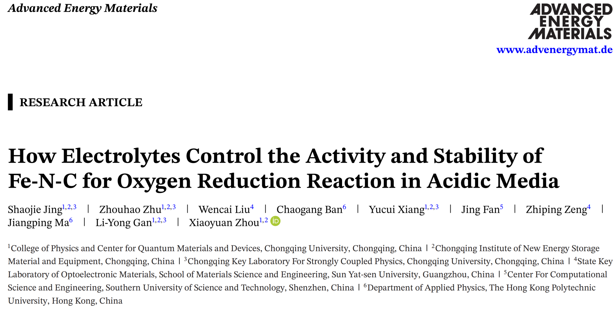周小元教授和甘立勇教授团队(联合中山大学、南方科技大学、香港理工大学等)在国际知名期刊Advanced Energy Materials 发表题为 “How Electrolytes Control the Activity and Stability of Fe-N-C for Oxygen Reduction Reaction in Acidic Media” 的研究论文。该工作通过理论解析并设计实验验证,揭示了酸性氧还原反应工况下,电解质阴离子决定Fe-N-C单原子催化剂活性中心结构,从而调控催化活性与稳定性。