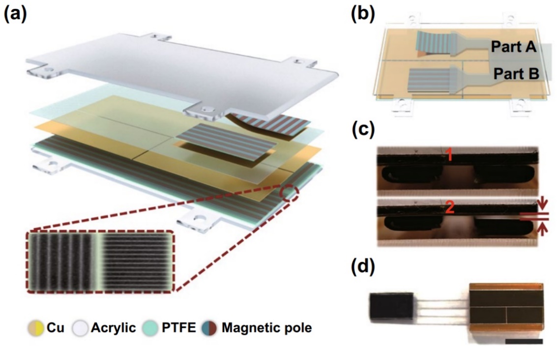 Ma-s-TS的器件结构如图一所示,该传感器件由定子和滑块两部分组成。定子从底部到顶部的多层结构依次是丙烯酸基板、halbach磁橡胶阵列、金属电极以及聚四氟乙烯薄膜。其中,磁橡胶的磁极分布方向相互垂直。滑块从下到上依次是金属铜和磁条,磁条的方向与底部定子中对应的磁条方向相同。图一(a)中的插图展示了基板和滑块上磁性阵列的显影照片。左侧的磁阵是为了限制磁铁的滑动,形成稳定滑动的吸引轨道,而右侧部分主要目的是通过滑动过程中磁场极性的变化,将滑动运动转换为接触/分离运动。图1(c)所示滑块的右部和在滑动过程中,定子与滑块的接触与分离状态。在此过程中,滑块的左侧部分与定子处于相互吸引状态。
