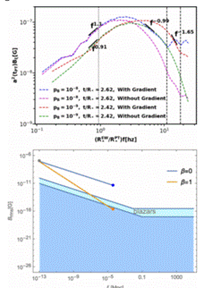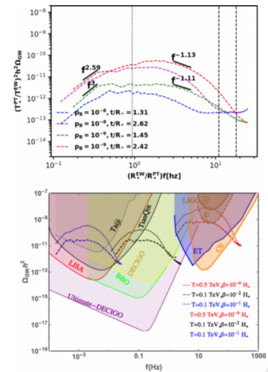 图:左上:电弱一阶相变产生的磁场能谱;左下:磁场后期演化预言的现在的磁场强度和关联尺度;右上:相变预言的引力波能量谱;右下:预言的引力波有机会被多种探测器观测到。