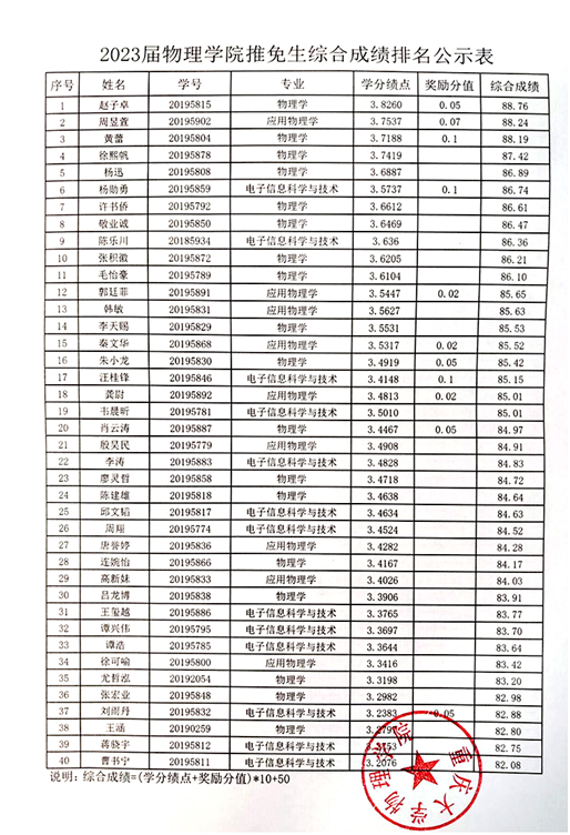 根据学校《关于开展2023年推荐优秀应届本科毕业生免试攻读研究生工作的通知》和《澳彩网 本科毕业生推免攻读硕士研究生实施细则》的相关规定,经过报名、初审、公开答辩程序,现将澳彩网 2023届推免生综合成绩排名予以公示:
