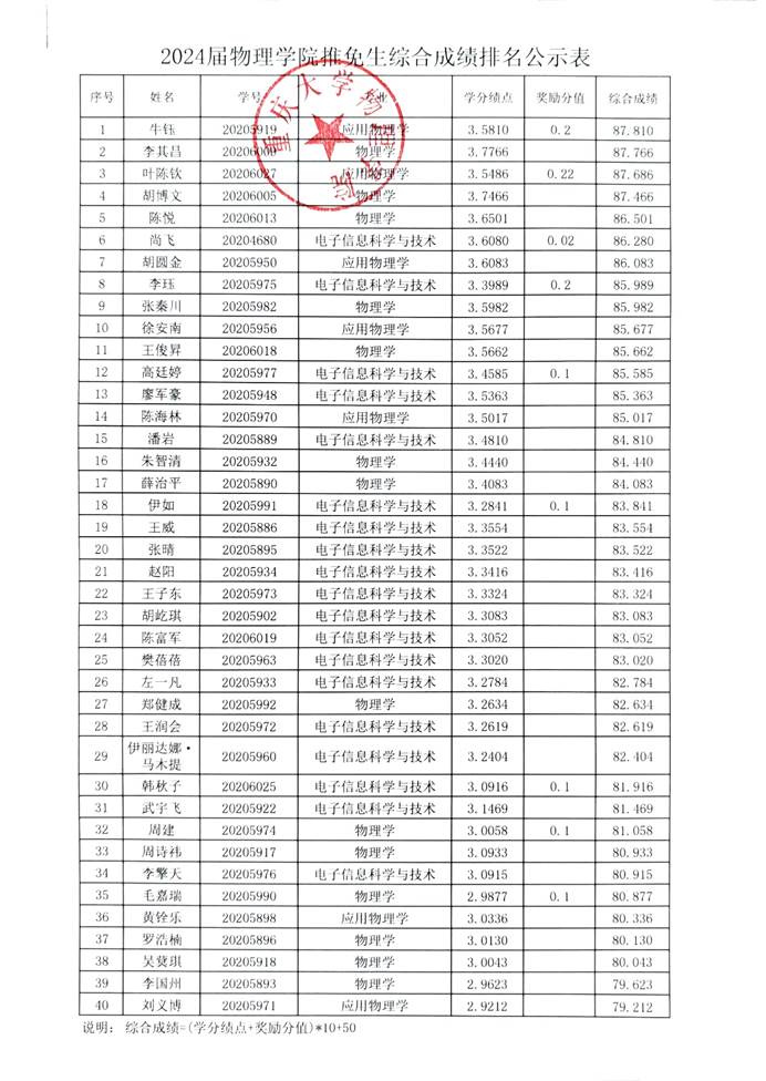 根据学校《关于开展2024年推荐优秀应届本科毕业生免试攻读硕士学位研究生工作的通知》和《澳彩网 本科毕业生推免攻读硕士研究生实施细则》的相关规定,经过报名、初审、公开答辩程序,现将澳彩网 2024年推免生综合成绩排名予以公示: