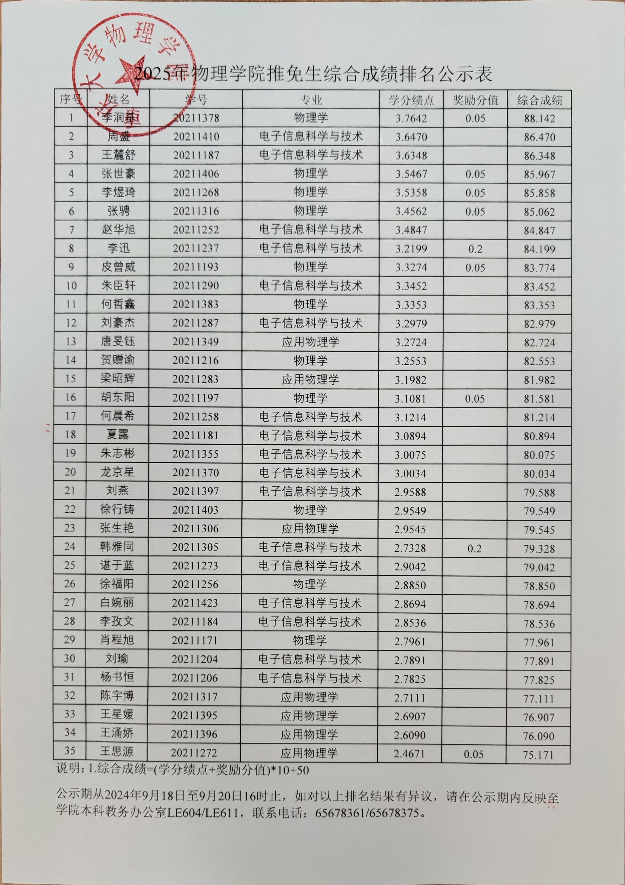 根据学校《关于开展2025年推荐优秀应届本科毕业生免试攻读研究生工作的通知》和《澳彩网 本科毕业生推荐攻读研究生实施细则》的相关规定,经过报名、初审、公开答辩程序,现将澳彩网 2025年推免生综合成绩排名予以公示: