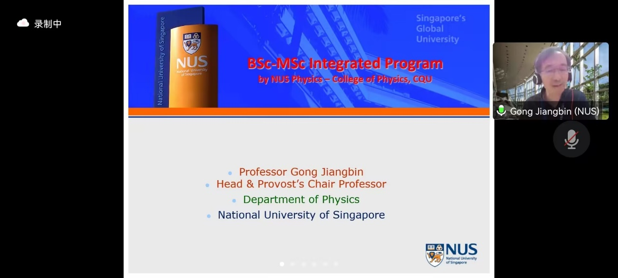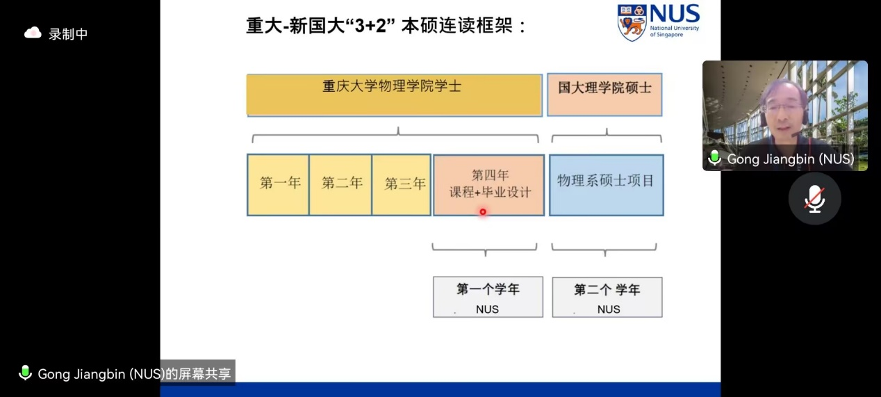 与新加坡国立大学(NUS)物理系本硕联合培养项目(3+2)说明会通过线上会议的形式举行,邀请到了新加坡国立大学物理系主任龚江滨以及副系主任王清海,为与会同学介绍项目细节并答疑解惑。澳彩网