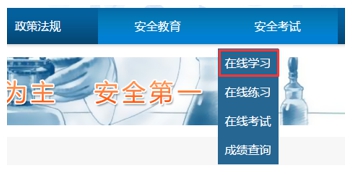 如图 5 所示,在线学习模块分主要有:文章类学习、题库类学习、实验室安全手册学习、常用安全标识学习和视频学习。考生点击选项后便可进行相应项目的学习。
