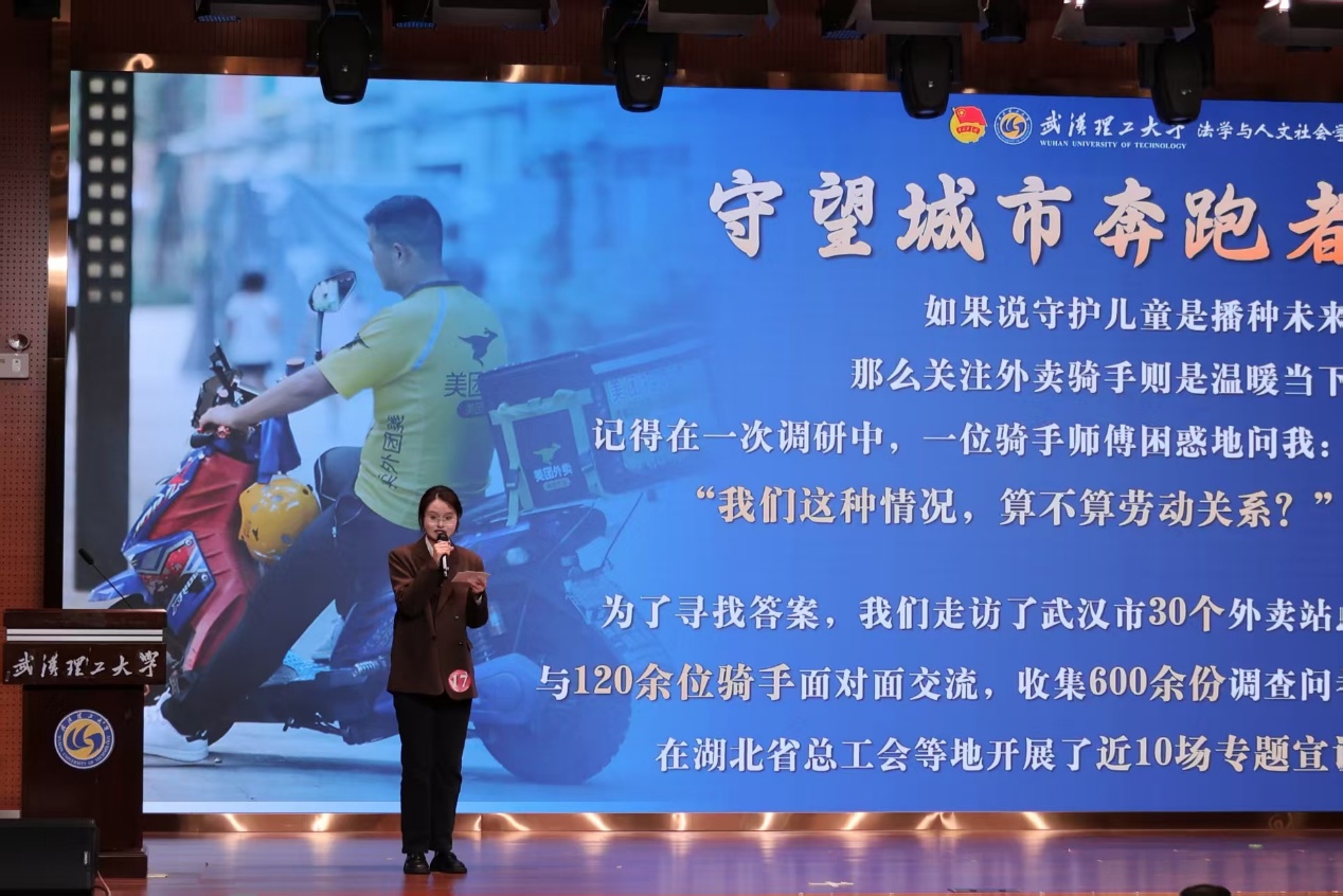 除了关注儿童法治教育,左婉同学还投身于外卖骑手权益保障的实践中。他和44名志愿者小伙伴奔赴武汉市经开区21个社区,用6周时间服务超2500人次,覆盖近850个家庭,并同步开展深度调研访谈。在一次调研中,骑手师傅问:“我们这种情况,算不算劳动关系?”带着这个疑问,她和团队走访了武汉市120余位骑手,面对面交流,收集600余人的意见,并在湖北省总工会等地开展了近10场实地调研,基于这些调研成果,他们将专业法律条文转化为通俗易懂的普法小贴士和维权指引,帮助骑手们更好地理解自身权益。
