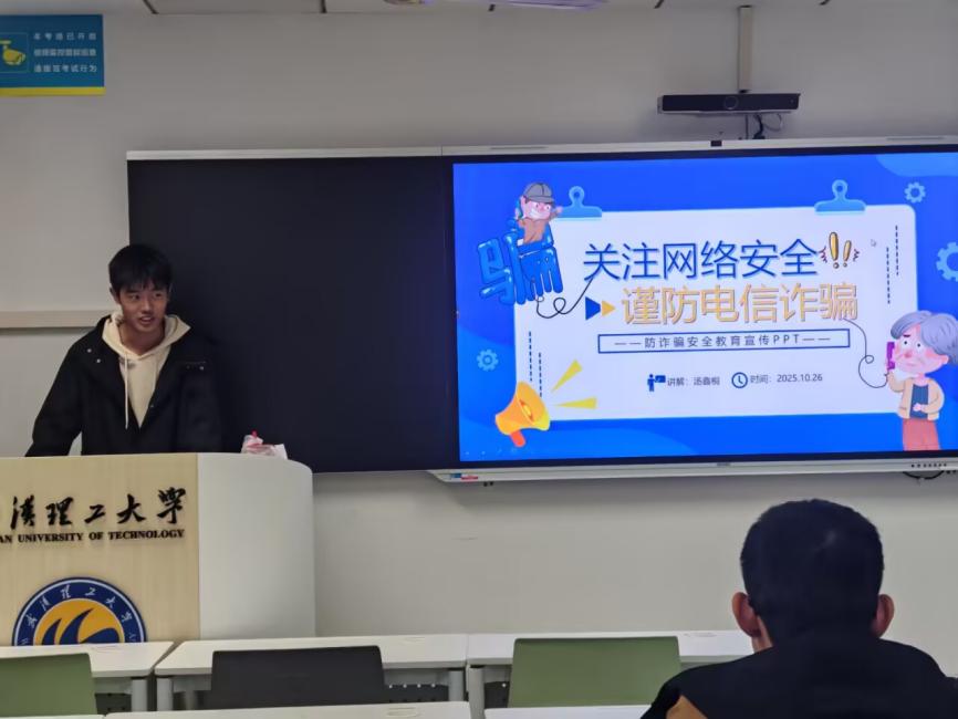 班会伊始,网络安全与防诈教育作为首要环节有序开展。汤鑫桐结合近期高校及周边发生的真实诈骗案例,生动剖析了网络刷单、虚假购物、冒充熟人借款、钓鱼链接诱导等常见诈骗手法。他详细讲解了防范诈骗的核心要点,包括如何识别可疑信息、设置高强度密码的技巧,以及遭遇诈骗后第一时间报警、留存证据的紧急处置流程,反复强调“不轻信、不透露、不转账”的防诈原则。此次讲解案例鲜活、警示性强,有效强化了同学们的风险防范意识和自我保护能力,为后续环节的开展筑牢了安全基础。