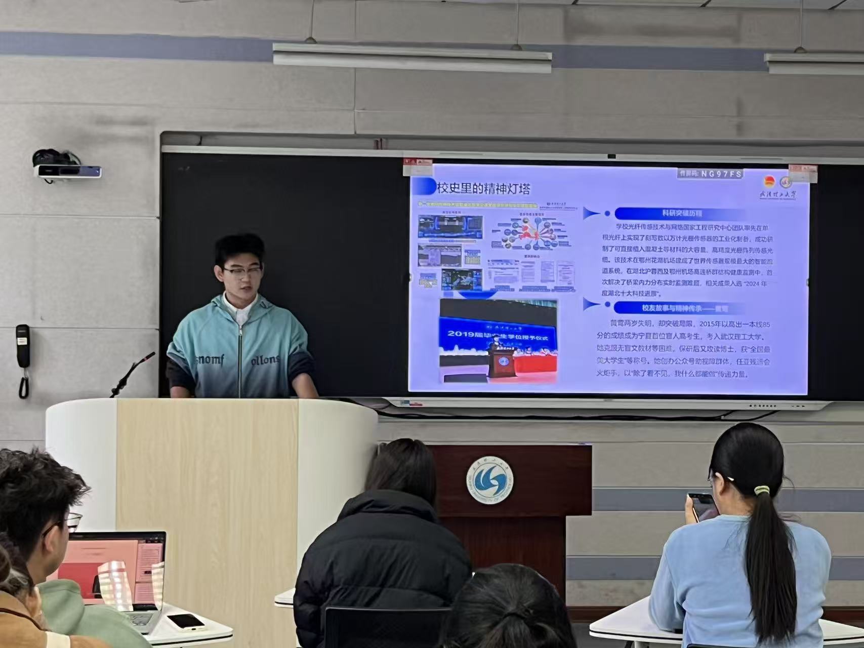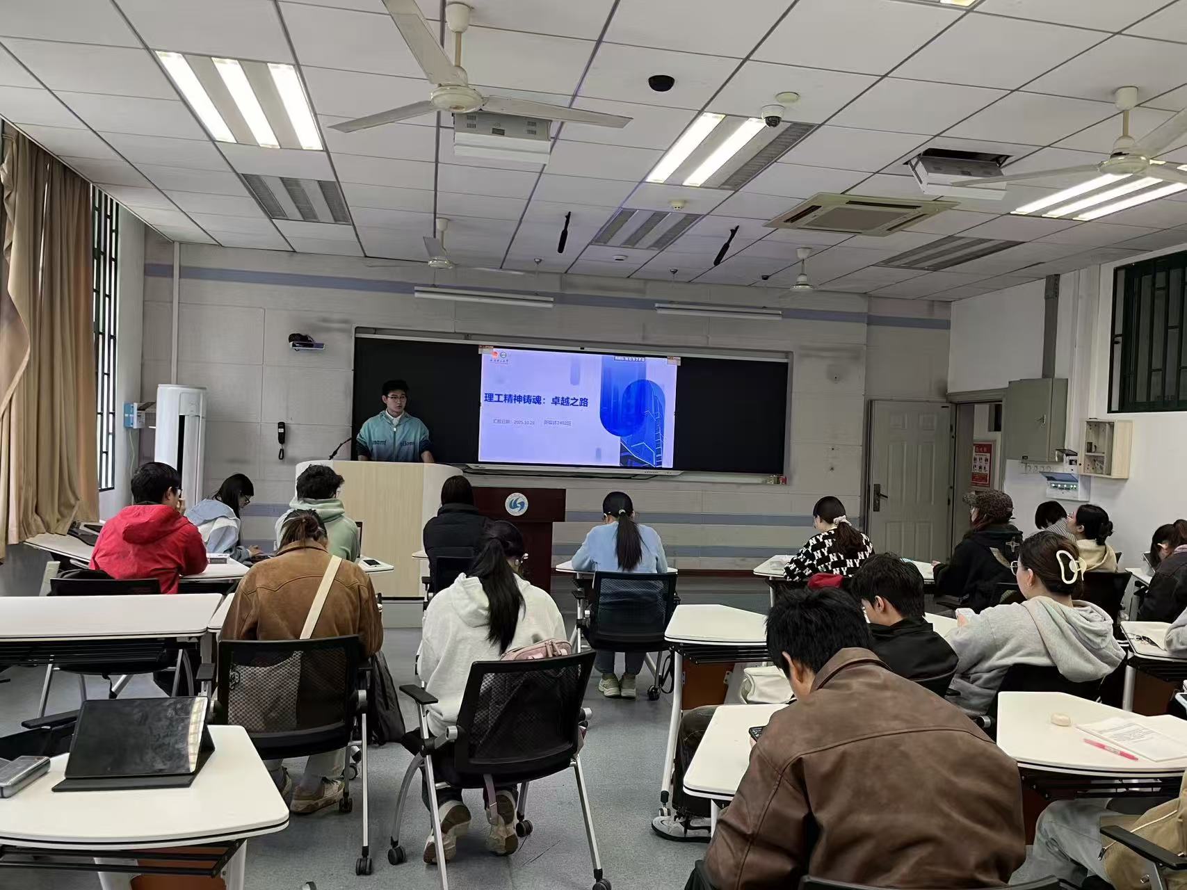 在“精神续航”环节,班会介绍了孙绪壕等优秀学长学姐的成长路径。他们在科研竞赛、志愿服务、融媒体建设等方面的卓越表现,展现了理工精神在实践中的传承与发扬。主讲人总结道:“作为新时代理工青年,我们要把理工精神转化为可触摸的纸页厚度,让卓越成为习惯。”