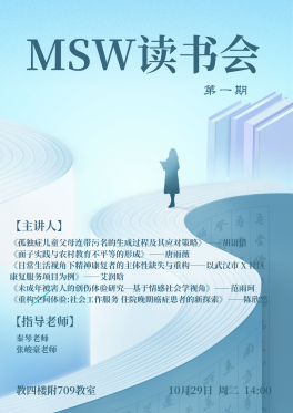 为落实澳彩网 学术氛围营造工程精神,提升澳彩网 研究生科研水平,强化研究生学习意识,增强研究生科研能力,10月29日下午,社会学系首期MSW新生读书会在教四楼附709室顺利举行。本次读书会由2024级的5位研究生分享他们对《孤独症儿童父母连带污名的生成过程及其应对策略》《面子实践与农村教育不平等的形成》《日常生活视角下精神康复者的主体性缺失与重构》《未成年被害人的创伤体验研究》以及《重构空间体验:社会工作服务住院晚期癌症患者的新探索》等五篇论文的解读,秦琴和张峻豪两位老师主持会议并对他们的解读进行点评,2023级和2024级研究生共同参与。